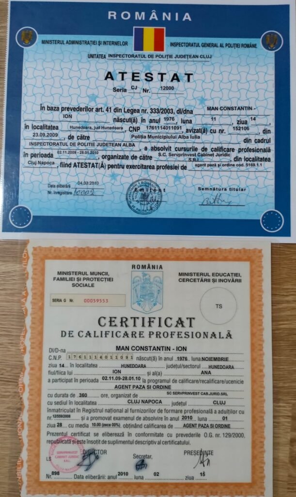 - Detin atestet eliberat de politie, certificat de absolvire a cursului de calificare profesionala si avizului politiei pentru portarma;